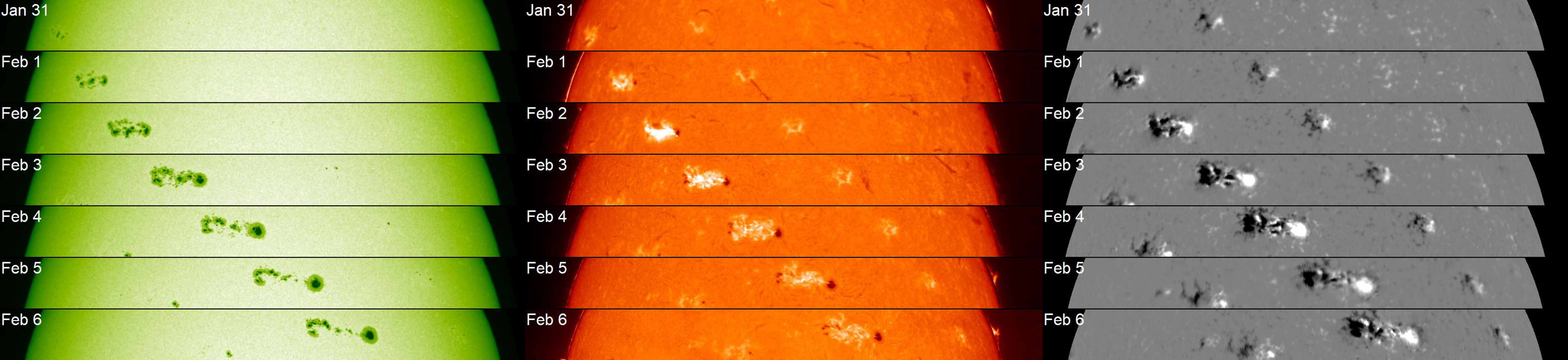 白色光(左)は太陽表面(光球)における黒点群の変化を示しており、密集した複雑な黒点群へと急速に発達した後、段々と東西に伸びていることが分かります。Hα線(中)は彩層(光球の上層)の水素ガスが見えており、フレアによって加熱されて強烈に輝いている様子や、黒点同士を繋ぐ磁力線に沿ったガスの運動も見られます。赤外線磁場分布(右)は白がN極、黒がS極で、磁場が複雑に入り組んでいる様子が分かります。1月30日に北半球東リムから出現した時は黒点がいくつか見える程度でしたが、黒点数の増加、面積の拡大が短時間で急速に進み、2月6日現在までにMクラスが53回、Xクラスが6回観測されています。