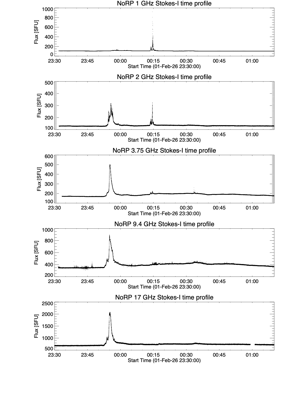 野辺山宇宙電波観測所に設置された偏波強度計でも今回のフレアに伴う電波放射を観測しています。爆発によって荷電粒子が急激に加熱されたり、加速されたりすることでさまざまな周波数帯の電波が発生します。図2では23:44UTのX8.1フレア発生直後に高周波側でピークが観測された一方で、00:33UT付近で発生したX2.8フレアでは電波放射はグラフに大きな変化はありません。また00:15UT付近では低周波(プロットの1段目と2段目)にて、電波領域のレーザー放射の一種である電子サイクロトロンメーザー放射 起源と思われる電波が短時間に非常に強く観測されています。X線では強度が弱いX1.5フレアの方が、低周波の電波(プロットの1段目)ではX線強度の強いX8.1フレアより明るいことは、フレア発生場所の磁場構造に示唆を与えます。